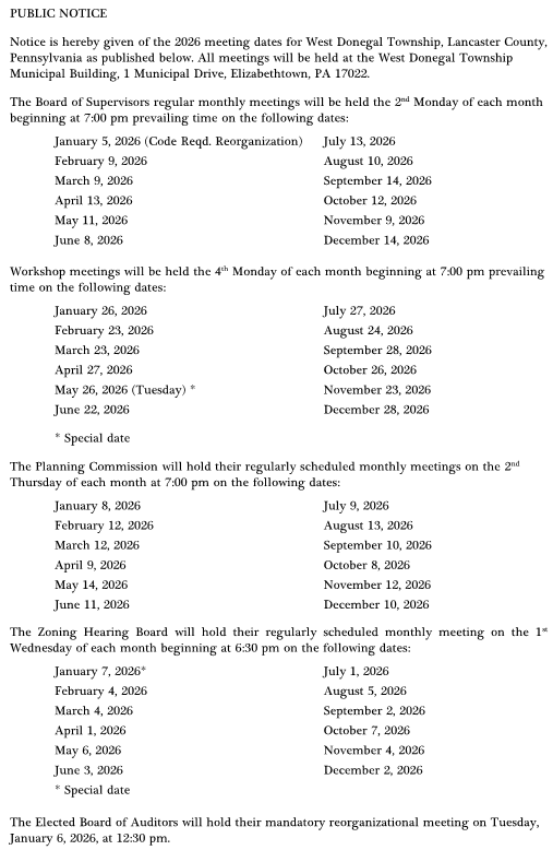 PUBLIC NOTICE - 2026 BudgetPUBLIC NOTICE The proposed 2026 West Donegal Township Budget was presented to the Board of Supervisors at its meeting on October 27, 2025, and will be open for public inspection starting October 29, 2025, at the West Donegal Township Municipal Building, 1 Municipal Drive, Elizabethtown PA, Monday-Friday from 7:30 am to 4:00 pm. The final budget will be adopted at the Board of Supervisors meeting on Monday, December 8, 2025, at 7:00 pm at the West Donegal Township Municipal Building. John O. Yoder, III, RA, Township Manager |